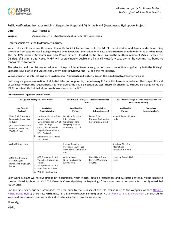 On behalf of Mpatamanga Hydro Power Limited (MHPL), we are pleased to invite you to the Request for Proposals (RFP) related to “Consultancy Services for Architectural Layout – Mpatamanga Hydropower Project buildings” in Malawi.<br>